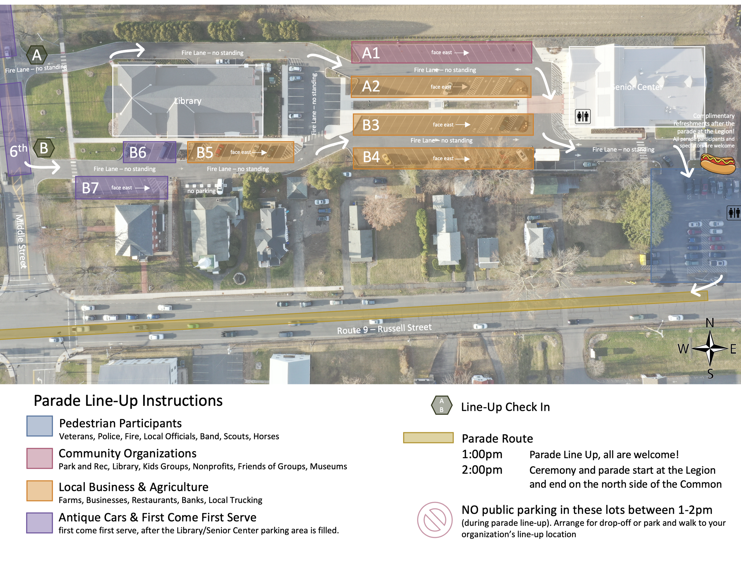 *No parking in the Senior Center/Library or Legion parking lots from noon-2pm on Sunday as this will be used for parade line-up